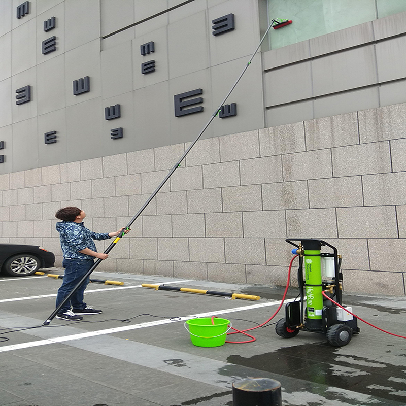 學(xué)校內(nèi),多為低樓層建筑,高度普遍在20米以下。此高度的建筑外墻、玻璃外墻、連廊的清潔,處于較為尷尬的境地。搭建腳手架登高進(jìn)行清潔,員工的人身安全得不到保障,危險(xiǎn)系數(shù)明顯上升,員工的工作積極性低。外包專業(yè)的高空清潔作業(yè)團(tuán)隊(duì),每年兩次清潔,投入費(fèi)用過高。意大利IPC高空清潔機(jī),能夠解決20米以下低高空外墻清潔的難題,設(shè)備自帶的四級過濾系統(tǒng),將水中的總?cè)芙夤腆w含量低,充分提高水的潔凈力,配合伸縮桿或快裝桿,其清潔高度可達(dá)20米,且清洗過后的作業(yè)表面自然風(fēng)干沒有水漬。無需登高作業(yè),既充分保障了安全性,又能完成清潔作業(yè)任務(wù)。